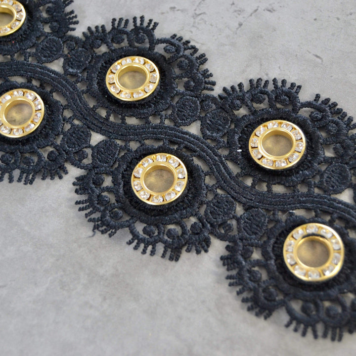 Elegant svart blomsterband med guld ringar i mitten, klätt med små stenar. Bandet är 55 mm brett.