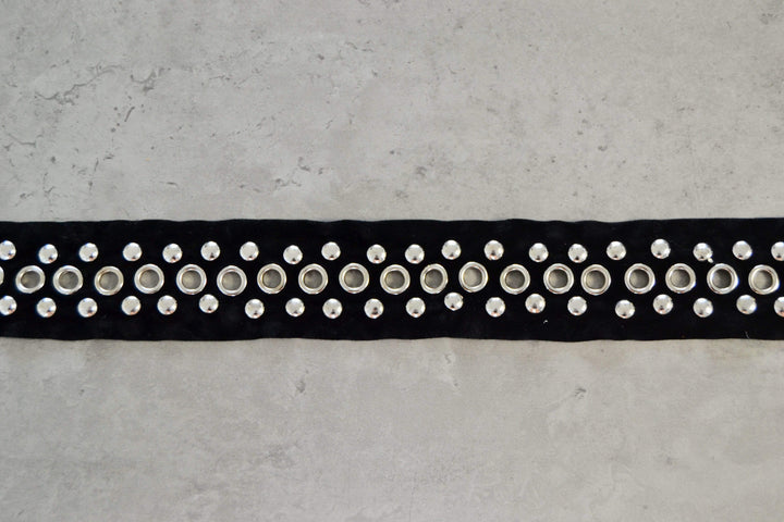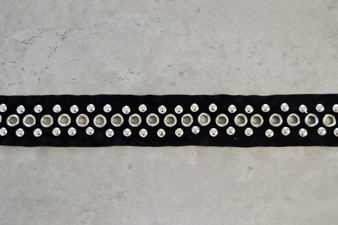 Svart velourband med runda nitar och hål i mitten av bandet. Bandet är 40 mm brett.
