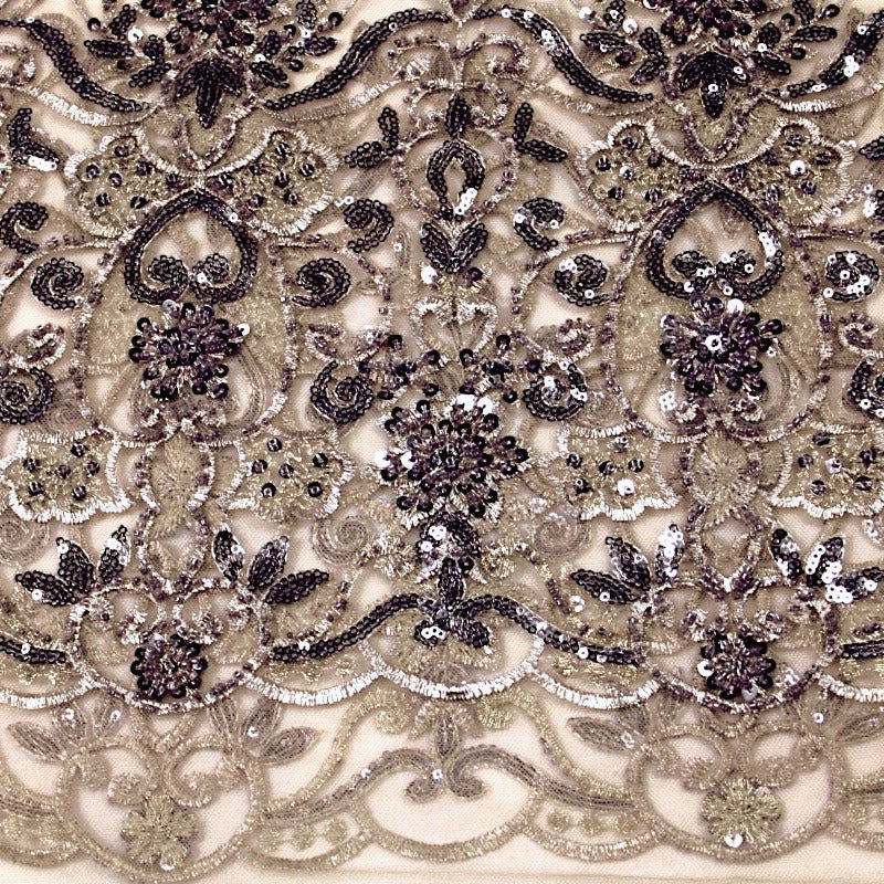 Det är använt två sorters runda paljetter med diameter på ca 2 mm respektive 4 mm. Dessutom används små rörformade pärlor. Paljetter och pärlor är påsydda i ett mönster med blomstermotiv. Tygets fulla bredd är 150 cm och mönstrets bredd är 128 cm.