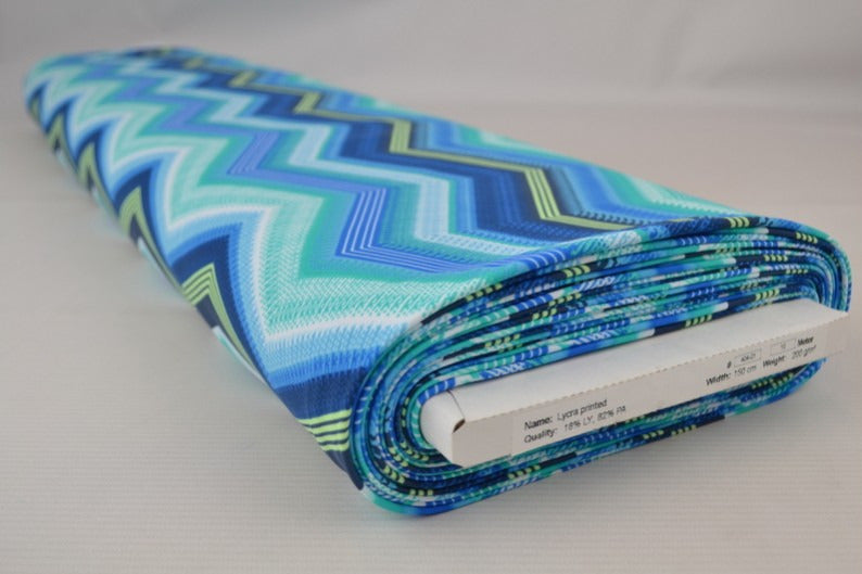 BLÅ LYCRA TYG FÖR BADKLÄDER OCH SPORTKLÄDER MED CHEVRONRÄNDER