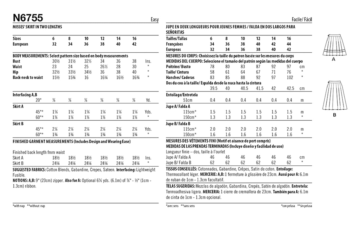 To udgaver af en klassisk plisseret nederdel der kan syes af begyndere og let øvede sykyndige. Mønsteret dækker størrelse 32-42 og kommer i to forskellige modeller. Begge modeller er med lynlås i siden, og opskriften indeholder instruktioner til hvordan man påsyer pyntebånd hvis dette ønskes. Dette produkt er en fysisk A5 kuvert som indeholder symønster og instruktioner. Instruktionerne er skrevet på engelsk og spansk, og inkluderer tips til tilpasning af mønsteret, klippelayout, symbolforklaring, samt illustreret trin-for-trin beskrivelse af hvordan du syer det færdige produkt. Der medfølger også en guide på dansk der forklarer generel fremgangsmåde og ordliste hvor almindelige engelske sytermer er oversat.