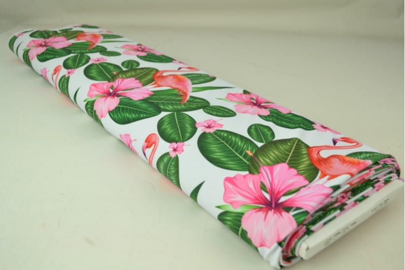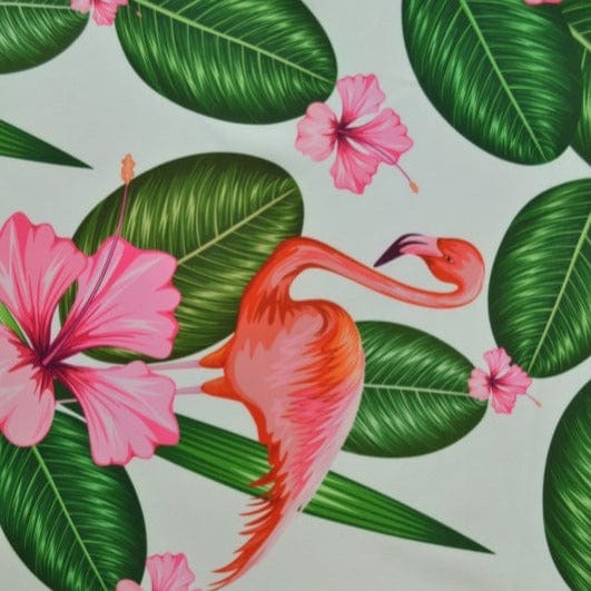 LYCRA TYG TILL BADEKLÄDER OCH SPORTKLÄDER MED FLAMINGO OCH LYSERÖDA BLOMMOR