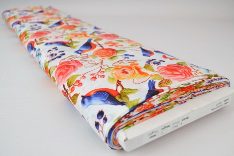 VITT VISCOSETYG MED FÅGLAR OCH ROSOR - DIGITAL TRYCK