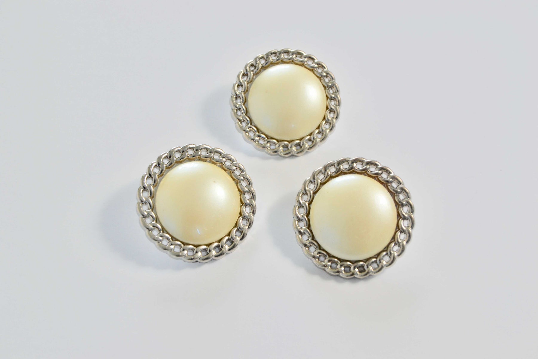 Vit ögonknapp med pärlor. Knapparna är tillverkade av plast och har en diameter på ca. 33 mm.