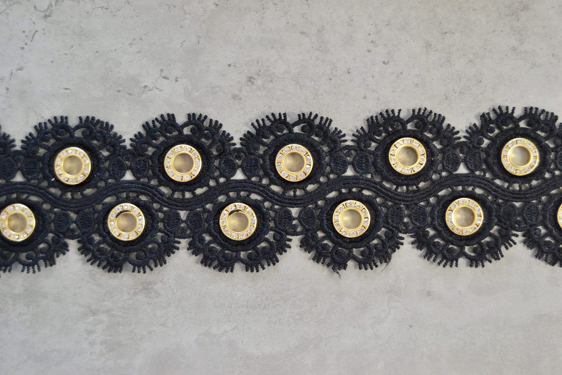 Elegant svart blomsterband med guld ringar i mitten, klätt med små stenar. Bandet är 55 mm brett.