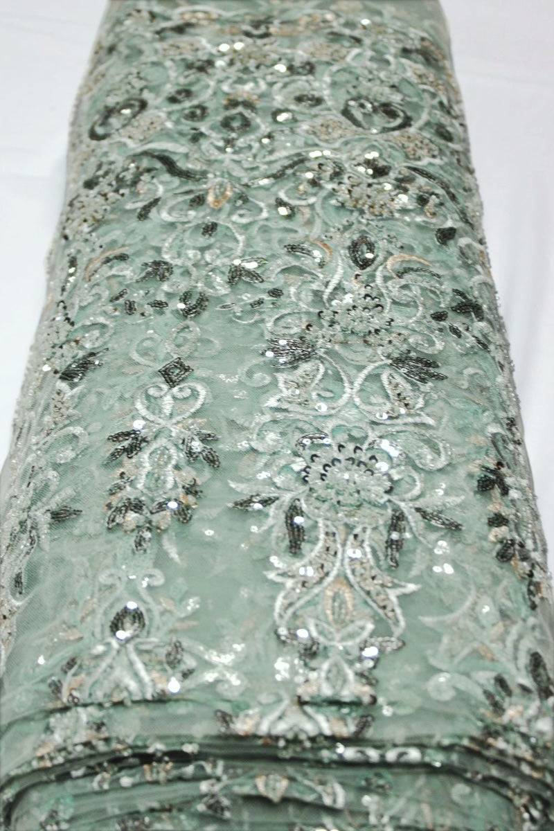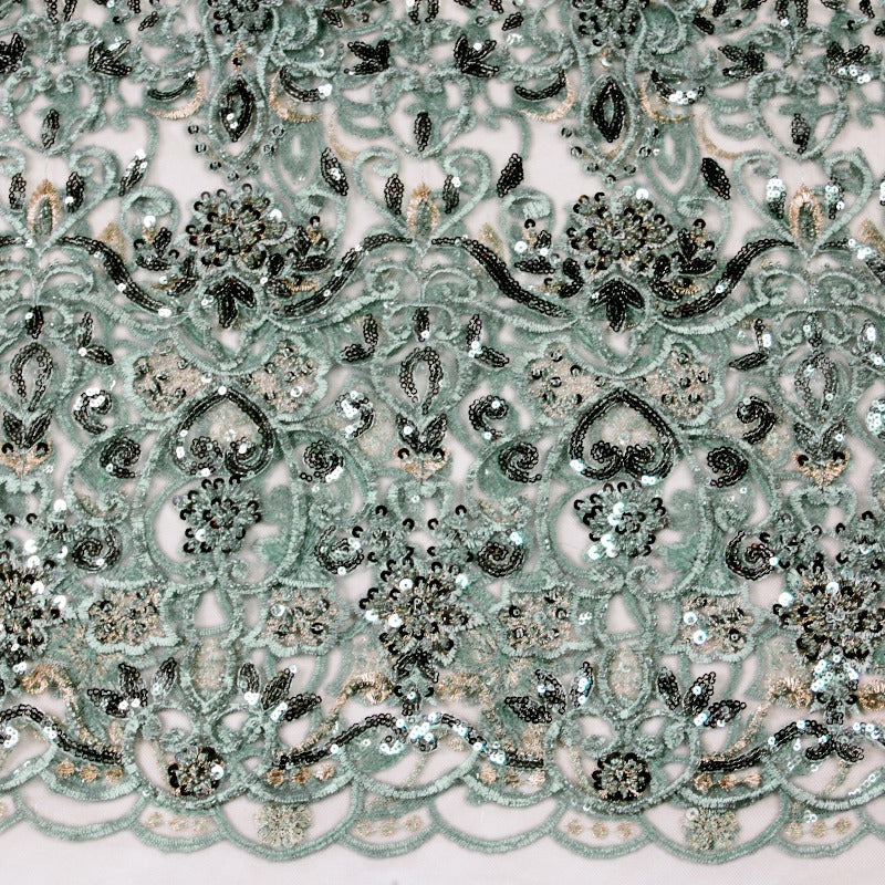 Finmaskigt tylltyg med broderi samt påsydda paljetter och pärlor. Tyget är utan stretch, men som de flesta nättyger ger det efter lite. Det här vackra paljettyget är ett perfekt val för festliga plagg som klänningar, blusar, slöjor och liknande – oavsett om det är till bröllop, konfirmation, gala eller andra speciella tillfällen. Det kan även användas för att sy vackra dekorationsgardiner eller väggdekorationer som lyser upp i vilken festlokal som helst.