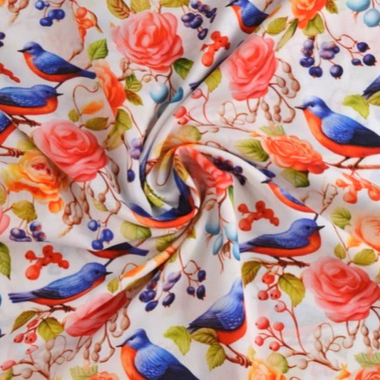 VITT VISCOSETYG MED FÅGLAR OCH ROSOR - DIGITAL TRYCK